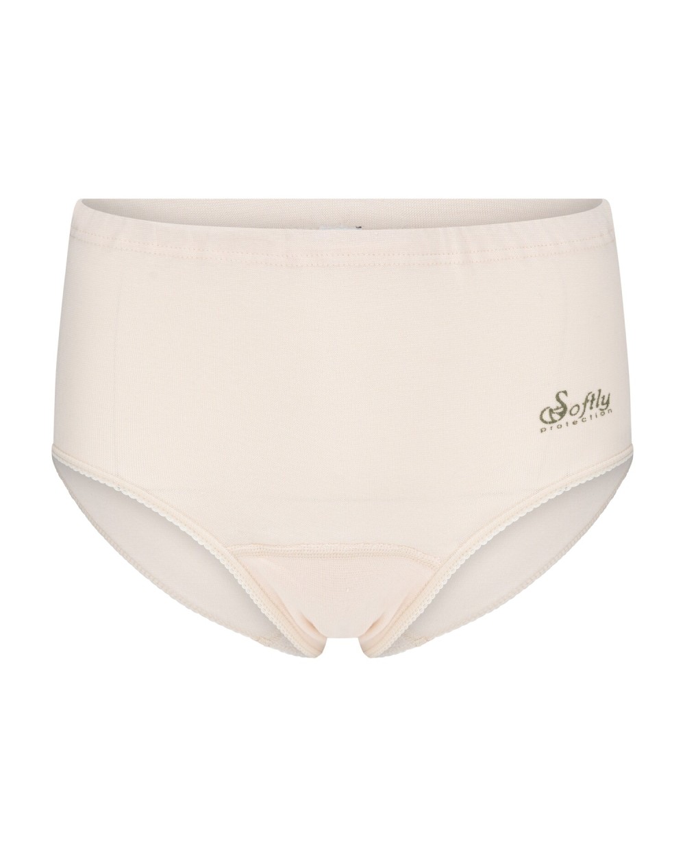 Dames slip zonder zijnaden. De slip is aan de bovenzijde omgezoomd met een tunnelelastiek en de pijpen zijn afgewerkt met een zacht elastiek. De slip is voorzien van platte en zachte naden. De slip heeft één katoenen kruisje.